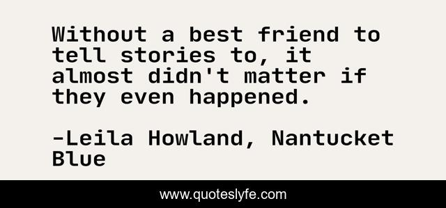 This page presents the quote "Without a best friend to tell stories to, it almost didn't matter if they even happened.". Author of this quote is Leila Howland, Nantucket Blue. This quote is about friends, life, friendship, stories,.