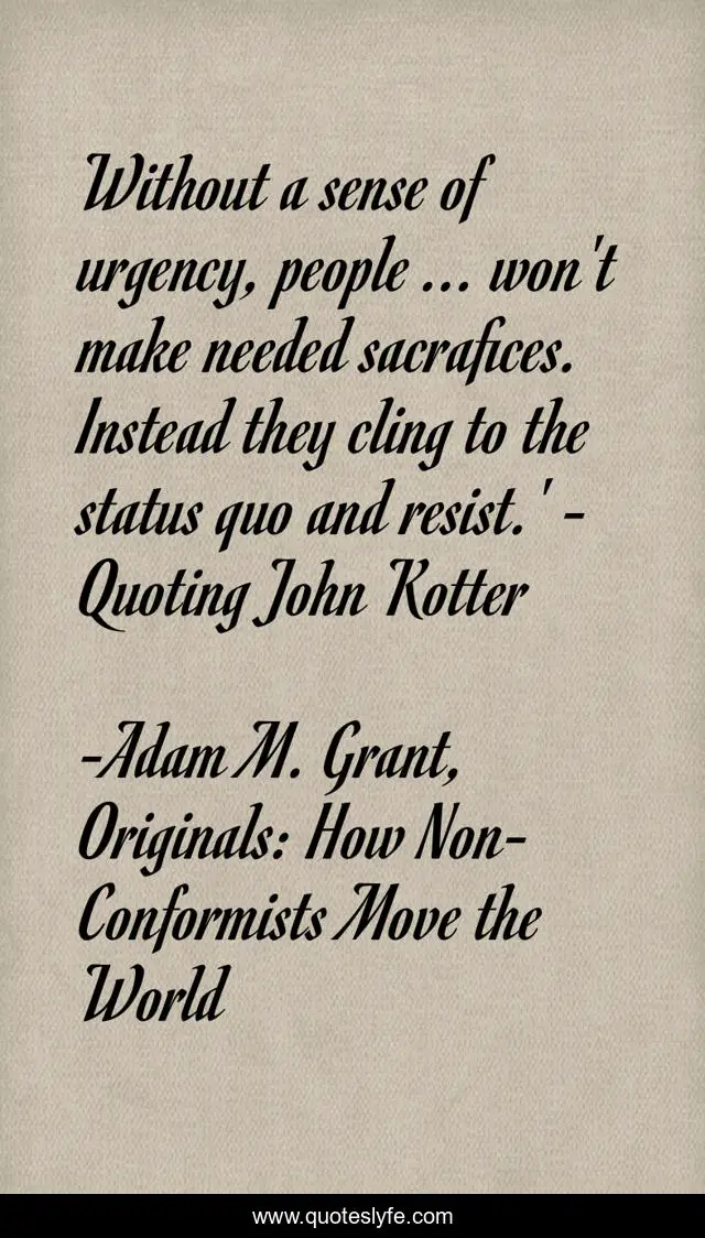 This page presents the quote "Without a sense of urgency, people ... won't make needed sacrafices. Instead they cling to the status quo and resist.' - Quoting John Kotter". Author of this quote is Adam M. Grant, Originals: How Non-Conformists Move the World. This quote is about timing, motivation, sense-of-urgency,.