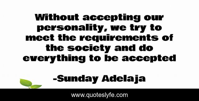 This page presents the quote "Without accepting our personality, we try to meet the requirements of the society and do everything to be accepted". Author of this quote is Sunday Adelaja. This quote is about life, goal, everything, requirement, calling, try, society, purpose, accepting,.