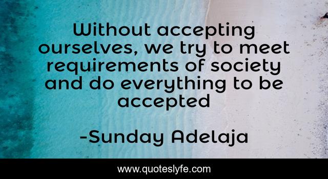 This page presents the quote "Without accepting ourselves, we try to meet requirements of society and do everything to be accepted". Author of this quote is Sunday Adelaja. This quote is about life, goal, mission, calling, society, purpose, meet,.