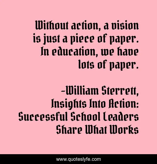 This page presents the quote "Without action, a vision is just a piece of paper. In education, we have lots of paper.". Author of this quote is William Sterrett, Insights Into Action: Successful School Leaders Share What Works. This quote is about action, leadership, paper, vision,.