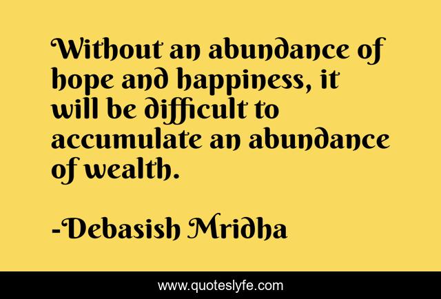 This page presents the quote "Without an abundance of hope and happiness, it will be difficult to accumulate an abundance of wealth.". Author of this quote is Debasish Mridha. This quote is about miraboli, abundance-of-wealth, abundance-of-hope, accumulate-wealth, oscar-wilde, philosophy, debasish-mridha, tagore, quotes,.