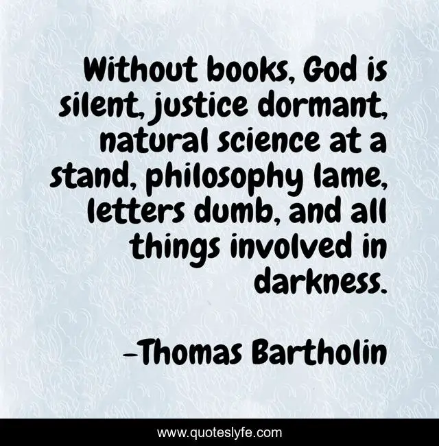 This page presents the quote "Without books, God is silent, justice dormant, natural science at a stand, philosophy lame, letters dumb, and all things involved in darkness.". Author of this quote is Thomas Bartholin. .