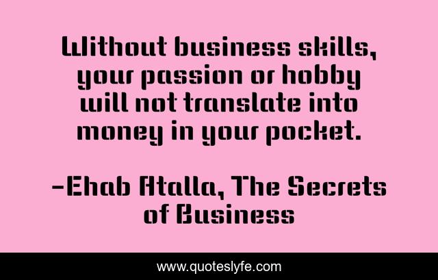 This page presents the quote "Without business skills, your passion or hobby will not translate into money in your pocket.". Author of this quote is Ehab Atalla, The Secrets of Business. This quote is about business, entrepreneurship,.