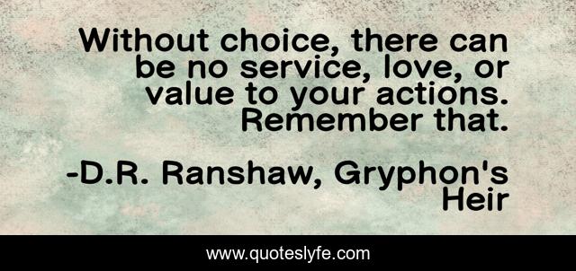 This page presents the quote "Without choice, there can be no service, love, or value to your actions. Remember that.". Author of this quote is D.R. Ranshaw, Gryphon's Heir. .