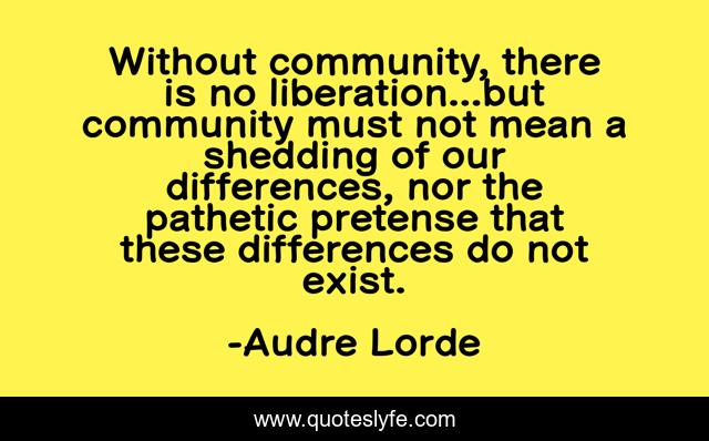 This page presents the quote "Without community, there is no liberation...but community must not mean a shedding of our differences, nor the pathetic pretense that these differences do not exist.". Author of this quote is Audre Lorde. This quote is about reconciliation, difference, community,.