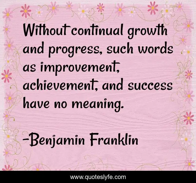 This page presents the quote "Without continual growth and progress, such words as improvement, achievement, and success have no meaning.". Author of this quote is Benjamin Franklin. This quote is about growth, achievement,.