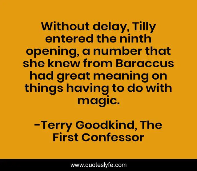 This page presents the quote "Without delay, Tilly entered the ninth opening, a number that she knew from Baraccus had great meaning on things having to do with magic.". Author of this quote is Terry Goodkind, The First Confessor. This quote is about ninth-opening, magic,.