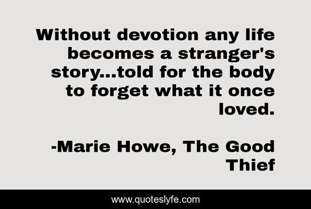 This page presents the quote "Without devotion any life becomes a stranger's story...told for the body to forget what it once loved.". Author of this quote is Marie Howe, The Good Thief. .