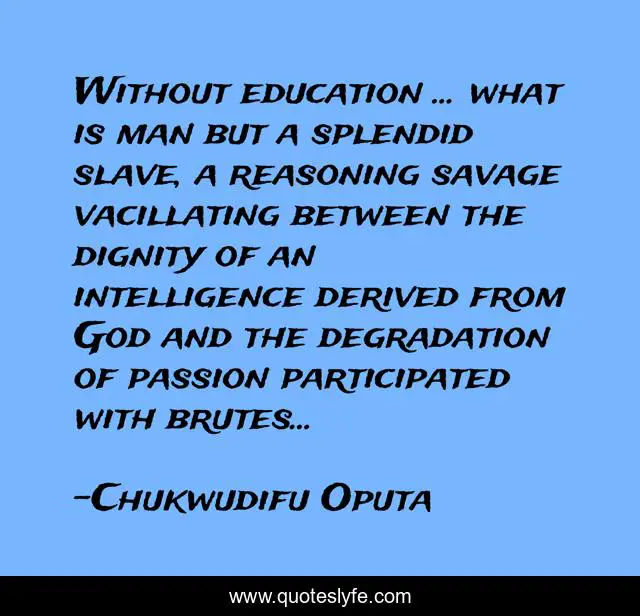 This page presents the quote "Without education … what is man but a splendid slave, a reasoning savage vacillating between the dignity of an intelligence derived from God and the degradation of passion participated with brutes…". Author of this quote is Chukwudifu Oputa. This quote is about education, growth, life-lessons,.