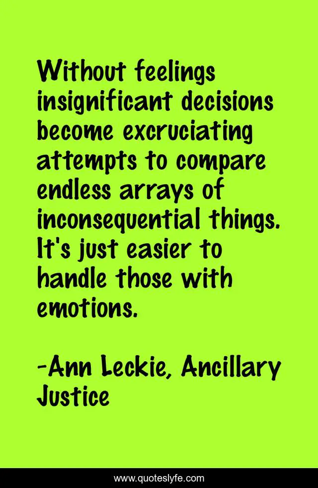 "Ann Leckie, Ancillary Justice Quotes." Quoteslyfe.com, 2025. Fri. 05 Dec. 2025. <https://www.quoteslyfe.com/quote/Without-feelings-insignificant-decisions-become-excruciating-attempts-211601>.