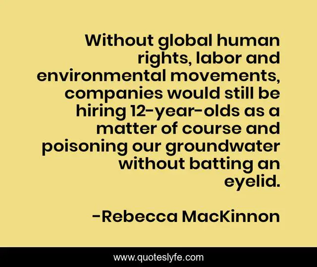 This page presents the quote "Without global human rights, labor and environmental movements, companies would still be hiring 12-year-olds as a matter of course and poisoning our groundwater without batting an eyelid.". Author of this quote is Rebecca MacKinnon. This quote is about matter, human, rights,.