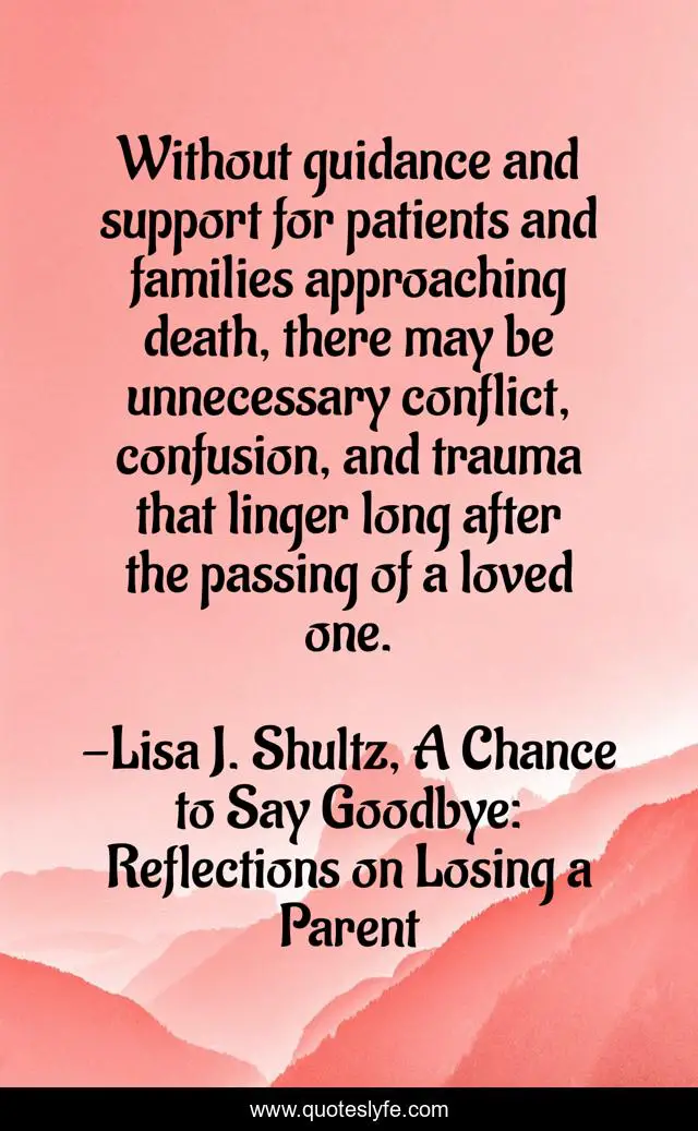 This page presents the quote "Without guidance and support for patients and families approaching death, there may be unnecessary conflict, confusion, and trauma that linger long after the passing of a loved one.". Author of this quote is Lisa J. Shultz, A Chance to Say Goodbye: Reflections on Losing a Parent. This quote is about death, end-of-life, support, supporting-others, death-of-a-loved-one, passing-away, passing, approaching-death, death-and-dying,.