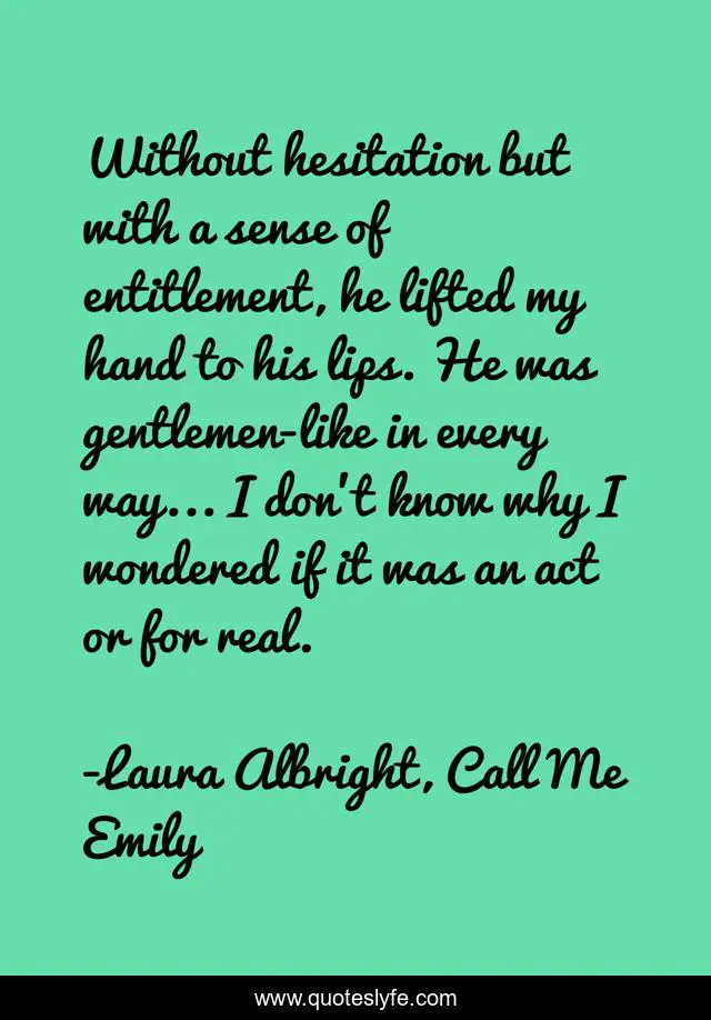 This page presents the quote "Without hesitation but with a sense of entitlement, he lifted my hand to his lips. He was gentlemen-like in every way... I don’t know why I wondered if it was an act or for real.". Author of this quote is Laura Albright, Call Me Emily. This quote is about romance, teen, humor,.