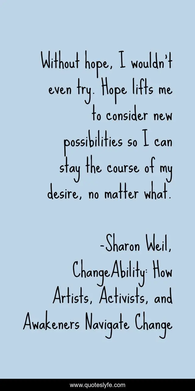 This page presents the quote "Without hope, I wouldn’t even try. Hope lifts me to consider new possibilities so I can stay the course of my desire, no matter what.". Author of this quote is Sharon Weil, ChangeAbility: How Artists, Activists, and Awakeners Navigate Change. This quote is about desire, possibility, hope, inspirational, enthusiasm, hopefulness, stay-the-course, inspiration,.