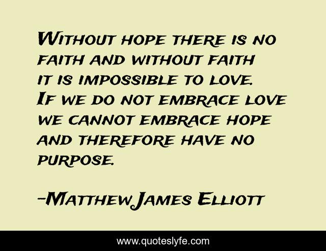 This page presents the quote "Without hope there is no faith and without faith it is impossible to love. If we do not embrace love we cannot embrace hope and therefore have no purpose.". Author of this quote is Matthew James Elliott. .