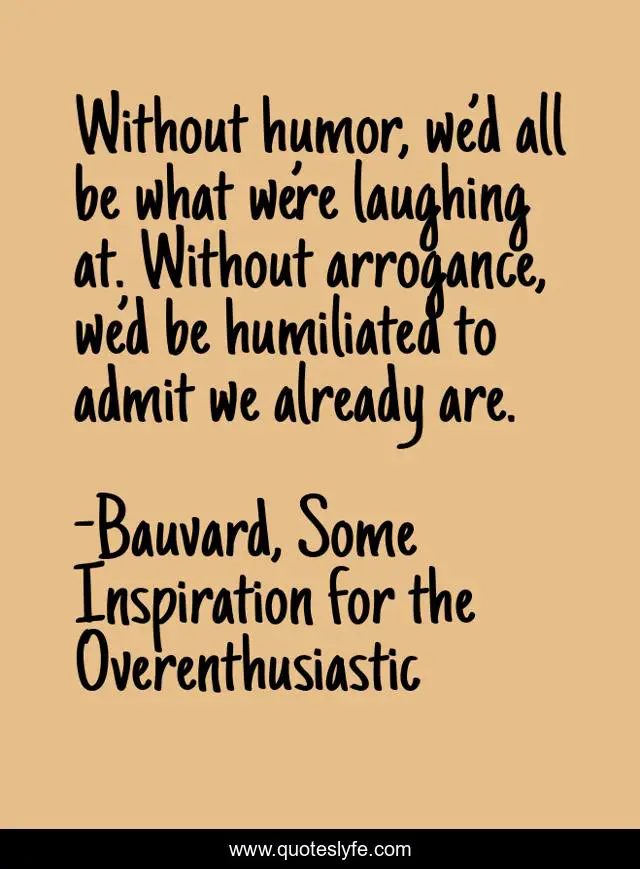 This page presents the quote "Without humor, we’d all be what we’re laughing at. Without arrogance, we’d be humiliated to admit we already are.". Author of this quote is Bauvard, Some Inspiration for the Overenthusiastic. This quote is about funny, comedy, humor, arrogance,.