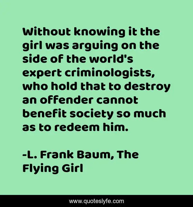This page presents the quote "Without knowing it the girl was arguing on the side of the world's expert criminologists, who hold that to destroy an offender cannot benefit society so much as to redeem him.". Author of this quote is L. Frank Baum, The Flying Girl. This quote is about crime, inspiriational, redemption, death-penalty,.