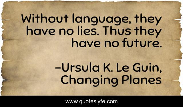 This page presents the quote "Without language, they have no lies. Thus they have no future.". Author of this quote is Ursula K. Le Guin, Changing Planes. This quote is about lying, future, thought-provoking, philosophy, truth,.