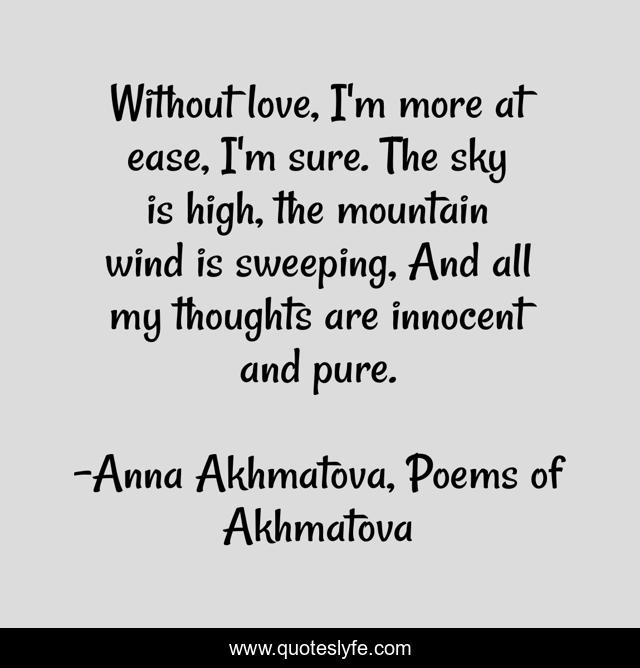 This page presents the quote "Without love, I'm more at ease, I'm sure. The sky is high, the mountain wind is sweeping, And all my thoughts are innocent and pure.". Author of this quote is Anna Akhmatova, Poems of Akhmatova. .