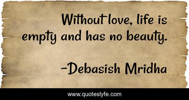 This page presents the quote "Without love, life is empty and has no beauty.". Author of this quote is Debasish Mridha. This quote is about life, inspirational, beauty, without-love, philosophy, debasish-mridha, quotes, life-is-empty, enthusiasm,.
