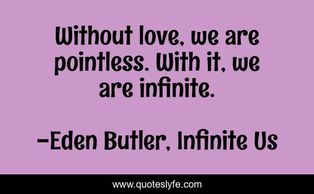 This page presents the quote "Without love, we are pointless. With it, we are infinite.". Author of this quote is Eden Butler, Infinite Us. This quote is about romance, second-chance-love, historical-romance, lost-love,.