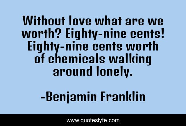 This page presents the quote "Without love what are we worth? Eighty-nine cents! Eighty-nine cents worth of chemicals walking around lonely.". Author of this quote is Benjamin Franklin. .