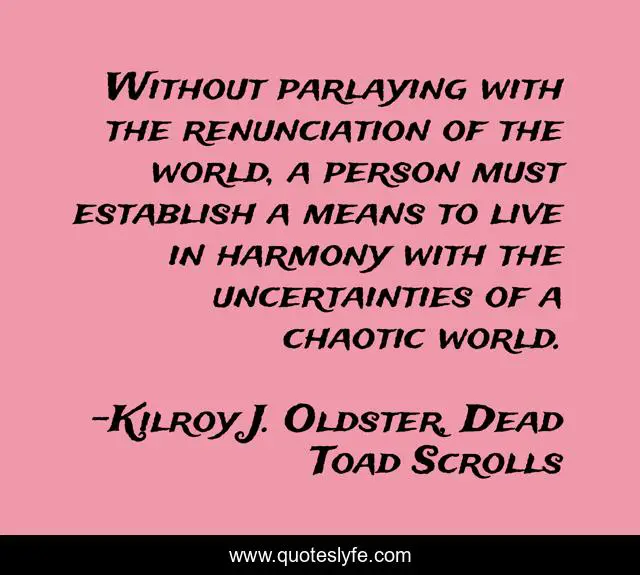 This page presents the quote "Without parlaying with the renunciation of the world, a person must establish a means to live in harmony with the uncertainties of a chaotic world.". Author of this quote is Kilroy J. Oldster, Dead Toad Scrolls. This quote is about chaotic, survival, adjustments, adaptation, self-preservation, endure,.