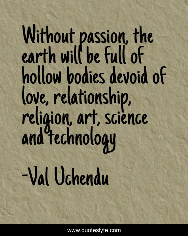 This page presents the quote "Without passion, the earth will be full of hollow bodies devoid of love, relationship, religion, art, science and technology". Author of this quote is Val Uchendu. This quote is about love, relationship, science, religion, passion, bodies, artists, earth, passionate,.