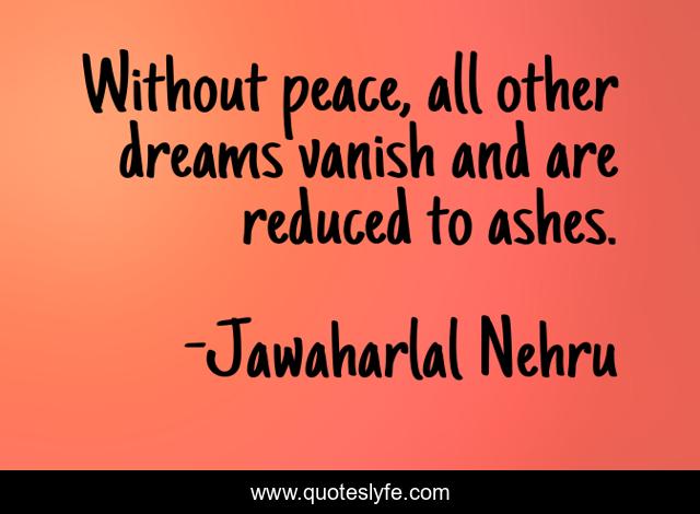 This page presents the quote "Without peace, all other dreams vanish and are reduced to ashes.". Author of this quote is Jawaharlal Nehru. This quote is about ashes, peace, without,.