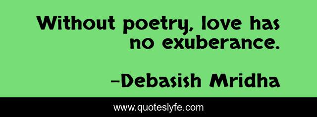 This page presents the quote "Without poetry, love has no exuberance.". Author of this quote is Debasish Mridha. This quote is about life, love, knowledge, inspirational, intelligence, philosophy, wisdom, quotes, affection,.