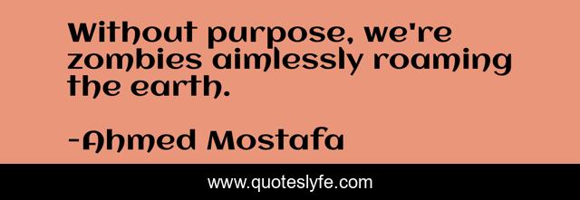 This page presents the quote "Without purpose, we're zombies aimlessly roaming the earth.". Author of this quote is Ahmed Mostafa. This quote is about why-are-we-here, zombies, purpose-in-life, purpose, aimlessness, aimless-life, roaming, purpose-of-living, purpose-of-life,.