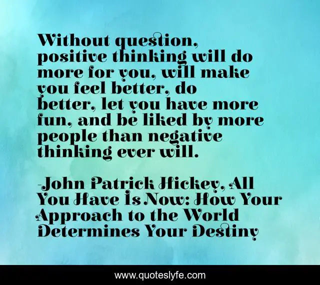"John Patrick Hickey, All You Have Is Now: How Your Approach to the World Determines Your Destiny Quotes." Quoteslyfe.com, 2025. Sun. 07 Dec. 2025. <https://www.quoteslyfe.com/quote/Without-question-positive-thinking-will-do-more-140767>.