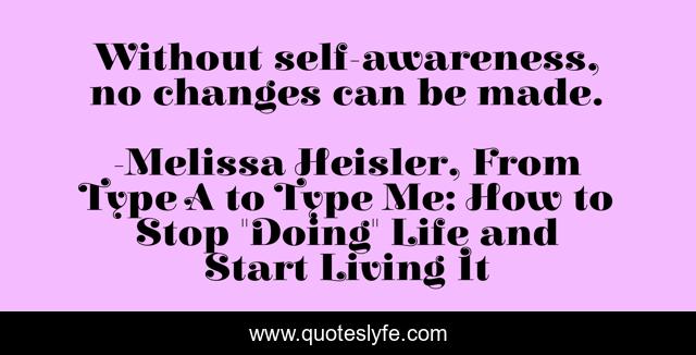 "Melissa Heisler, From Type A to Type Me: How to Stop "Doing" Life and Start Living It Quotes." Quoteslyfe.com, 2025. Fri. 05 Dec. 2025. <https://www.quoteslyfe.com/quote/Without-self-awareness-no-changes-can-be-106222>.