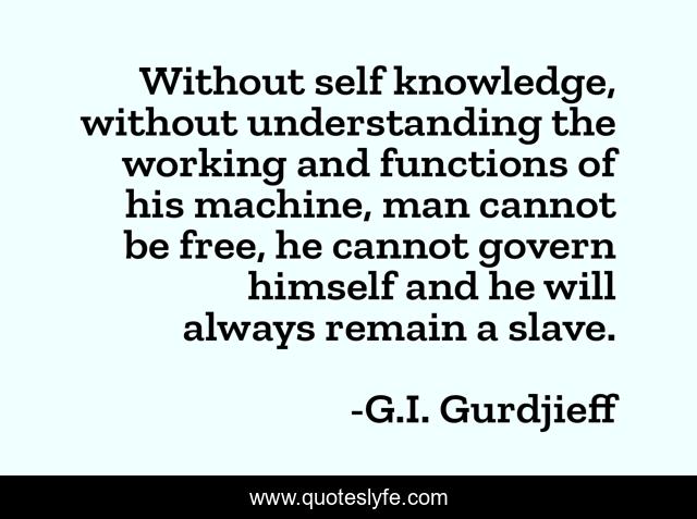 This page presents the quote "Without self knowledge, without understanding the working and functions of his machine, man cannot be free, he cannot govern himself and he will always remain a slave.". Author of this quote is G.I. Gurdjieff. This quote is about self-discovery, self-awareness, self-knowledge,.