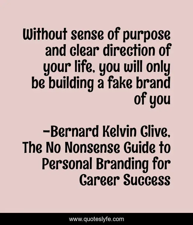 This page presents the quote "Without sense of purpose and clear direction of your life, you will only be building a fake brand of you". Author of this quote is Bernard Kelvin Clive, The No Nonsense Guide to Personal Branding for Career Success. This quote is about brands, branding, purpose-in-life, purpose, personal-branding,.