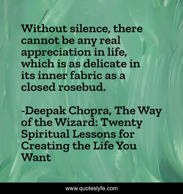 This page presents the quote "Without silence, there cannot be any real appreciation in life, which is as delicate in its inner fabric as a closed rosebud.". Author of this quote is Deepak Chopra, The Way of the Wizard: Twenty Spiritual Lessons for Creating the Life You Want. This quote is about spirituality, life, silence,.