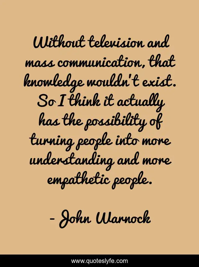 This page presents the quote "Without television and mass communication, that knowledge wouldn't exist. So I think it actually has the possibility of turning people into more understanding and more empathetic people.". Author of this quote is John Warnock. This quote is about television, knowledge,.