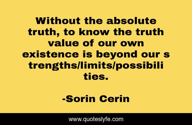 This page presents the quote "Without the absolute truth, to know the truth value of our own existence is beyond our strengths/limits/possibilities.". Author of this quote is Sorin Cerin. .