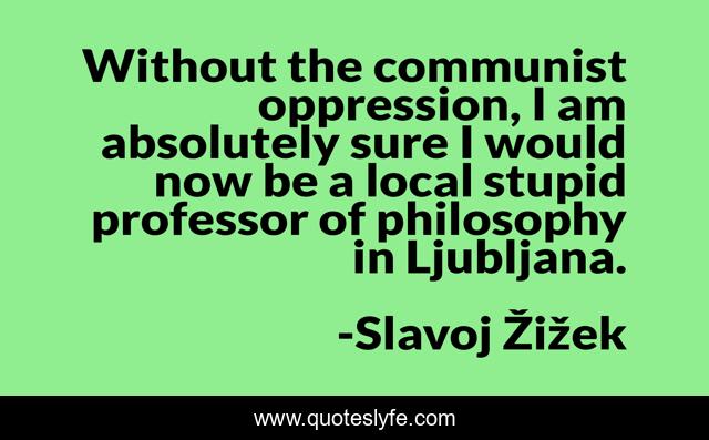 This page presents the quote "Without the communist oppression, I am absolutely sure I would now be a local stupid professor of philosophy in Ljubljana.". Author of this quote is Slavoj Žižek. This quote is about communism, slavoj-zizek, philosophy,.