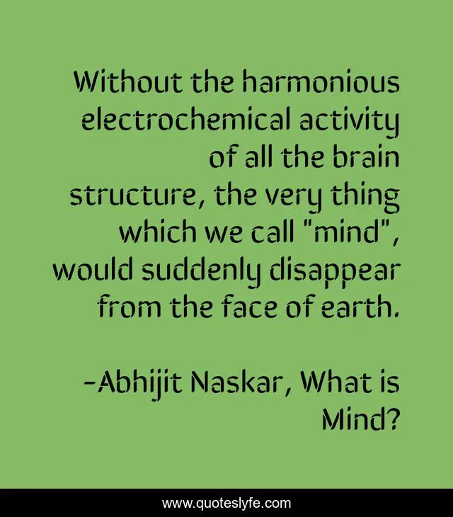 This page presents the quote "Without the harmonious electrochemical activity of all the brain structure, the very thing which we call "mind", would suddenly disappear from the face of earth.". Author of this quote is Abhijit Naskar, What is Mind?. This quote is about biology, brainy, consciousness, mind, human-mind, brain, science-of-mind, neuroscience,.