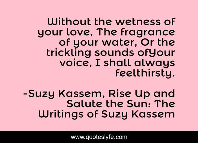 This page presents the quote "Without the wetness of your love, The fragrance of your water, Or the trickling sounds ofYour voice, I shall always feelthirsty.". Author of this quote is Suzy Kassem, Rise Up and Salute the Sun: The Writings of Suzy Kassem. This quote is about fragrant, wetness, trickling-water, touch, sounds, love-poem-for-her, love-poem-for-him, poetry, tears,.