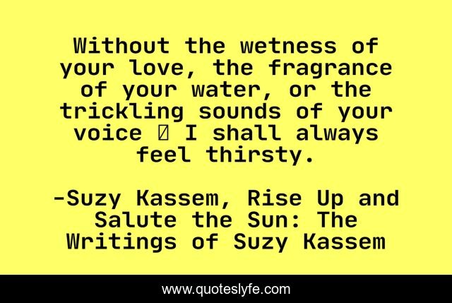This page presents the quote "Without the wetness of your love, the fragrance of your water, or the trickling sounds of your voice ― I shall always feel thirsty.". Author of this quote is Suzy Kassem, Rise Up and Salute the Sun: The Writings of Suzy Kassem. This quote is about sound, loved, voice, love, love-poetry, loving, frangrance, poetry-love, suzy-kassem-poetry,.