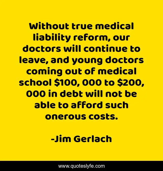 This page presents the quote "Without true medical liability reform, our doctors will continue to leave, and young doctors coming out of medical school $100, 000 to $200, 000 in debt will not be able to afford such onerous costs.". Author of this quote is Jim Gerlach. This quote is about school, debt, young,.