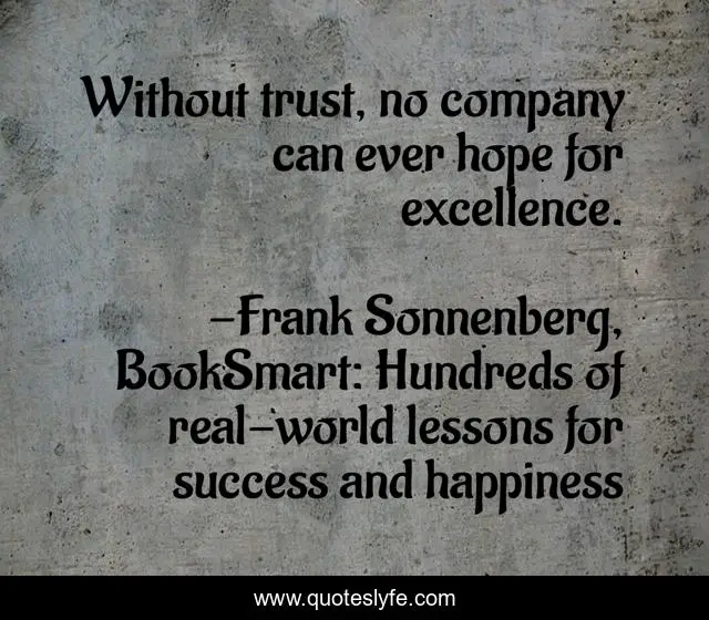 This page presents the quote "Without trust, no company can ever hope for excellence.". Author of this quote is Frank Sonnenberg, BookSmart: Hundreds of real-world lessons for success and happiness. This quote is about trust, trustworthiness,.