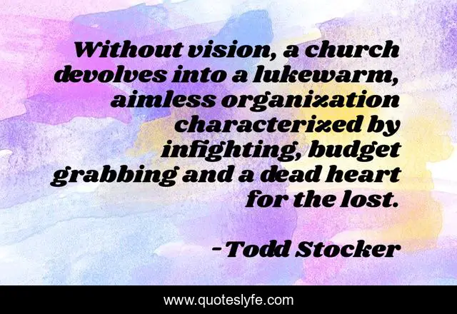 This page presents the quote "Without vision, a church devolves into a lukewarm, aimless organization characterized by infighting, budget grabbing and a dead heart for the lost.". Author of this quote is Todd Stocker. This quote is about confidence, lost, positive, motivational, budget, optimistic, church, evangelism,.