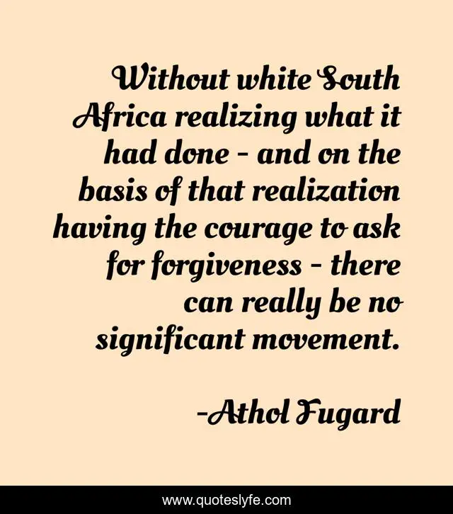 This page presents the quote "Without white South Africa realizing what it had done - and on the basis of that realization having the courage to ask for forgiveness - there can really be no significant movement.". Author of this quote is Athol Fugard. This quote is about forgiveness, done, africa,.