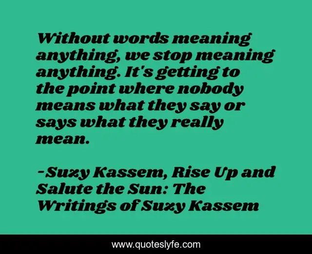 "Suzy Kassem, Rise Up and Salute the Sun: The Writings of Suzy Kassem Quotes." Quoteslyfe.com, 2025. Mon. 08 Dec. 2025. <https://www.quoteslyfe.com/quote/Without-words-meaning-anything-we-stop-meaning-112982>.