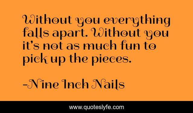 This page presents the quote "Without you everything falls apart. Without you it's not as much fun to pick up the pieces.". Author of this quote is Nine Inch Nails. This quote is about everything, apart, without, pieces, falls,.