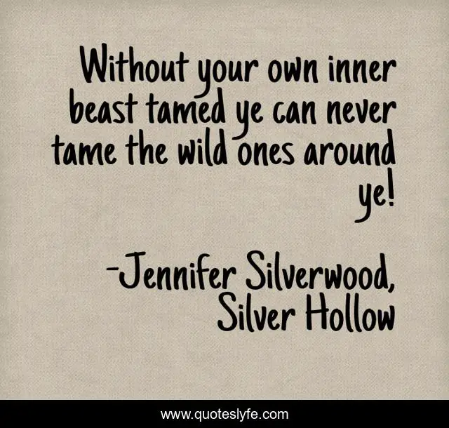 This page presents the quote "Without your own inner beast tamed ye can never tame the wild ones around ye!". Author of this quote is Jennifer Silverwood, Silver Hollow. This quote is about fairy-tale, fantasy-fiction, paranormal-romance,.